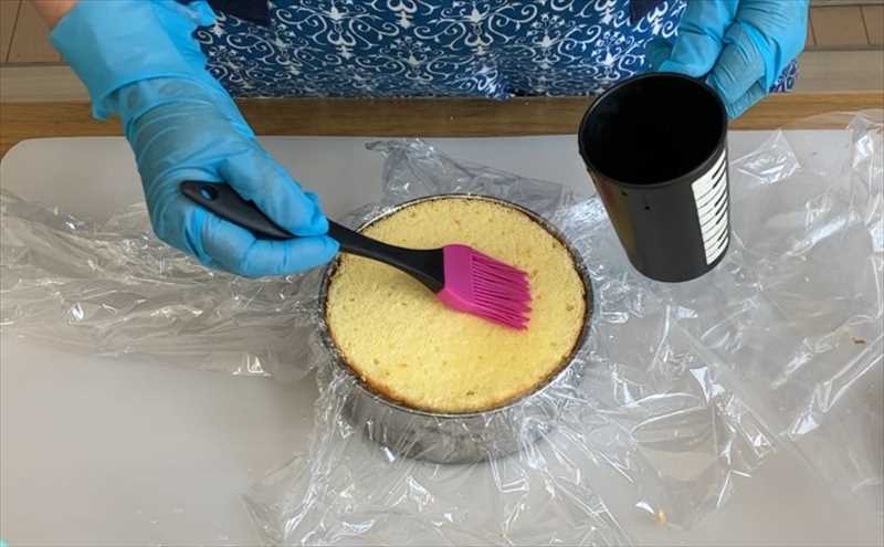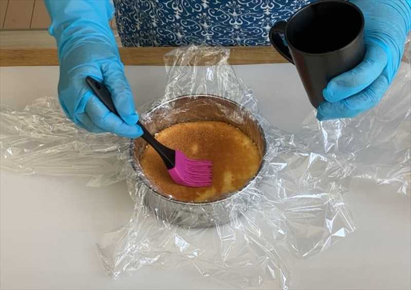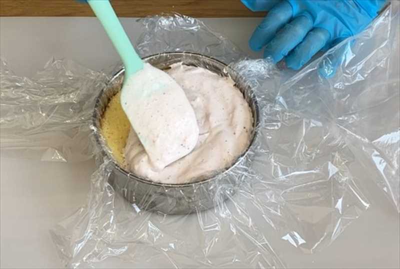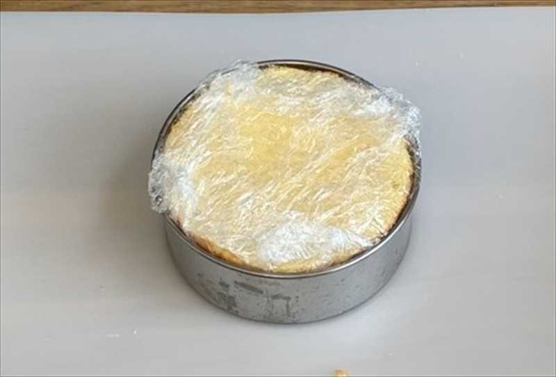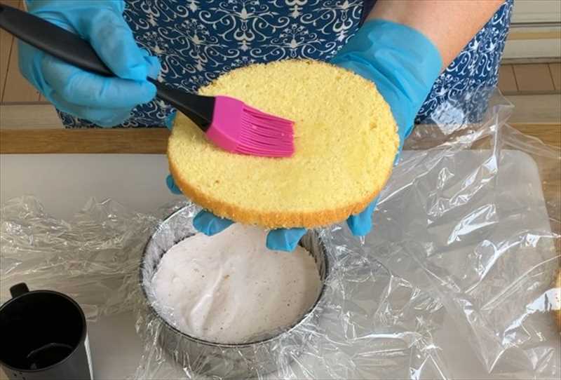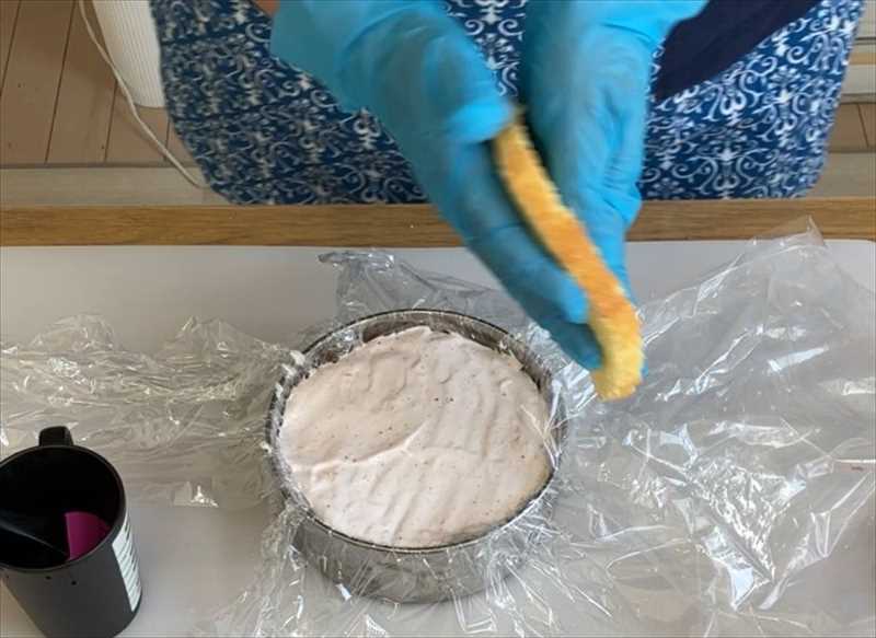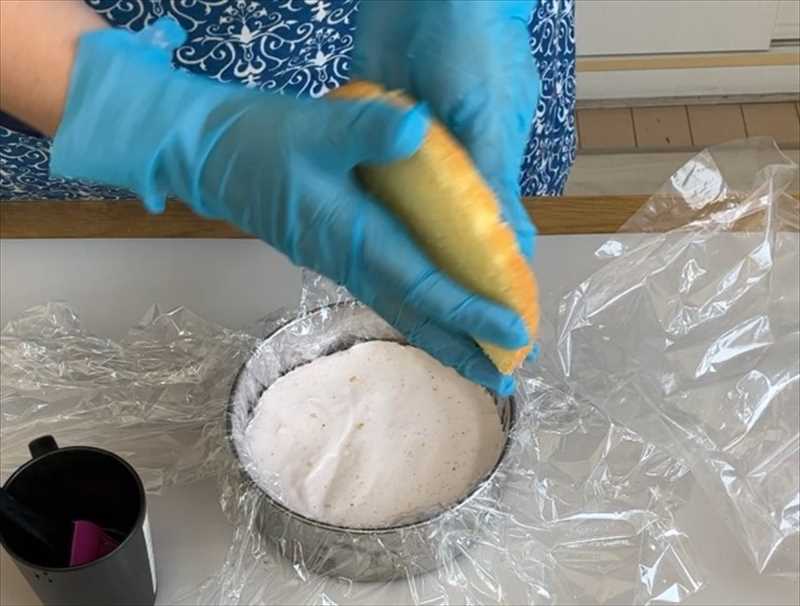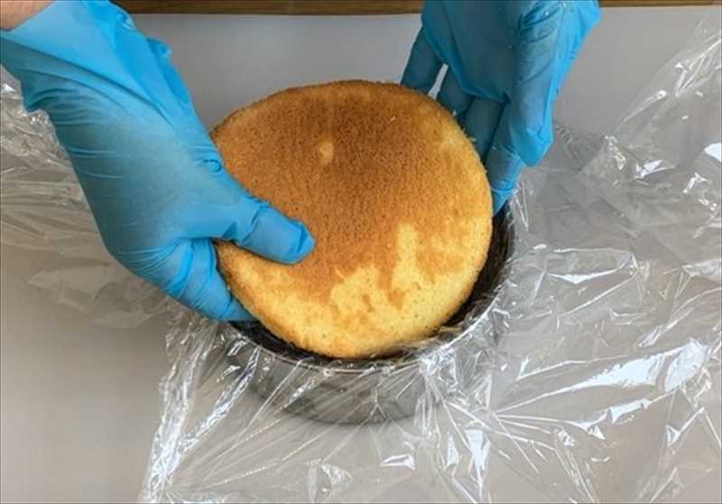 ラップを敷いた型へスライスしたスポンジを1枚、敷き込みます。