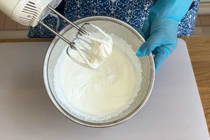 ボウルを逆さまにしてクリームが流れず クリームがボウルに張り付くくらいを目安に泡立てます。