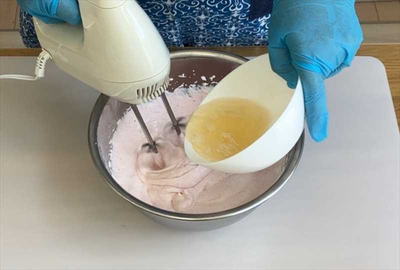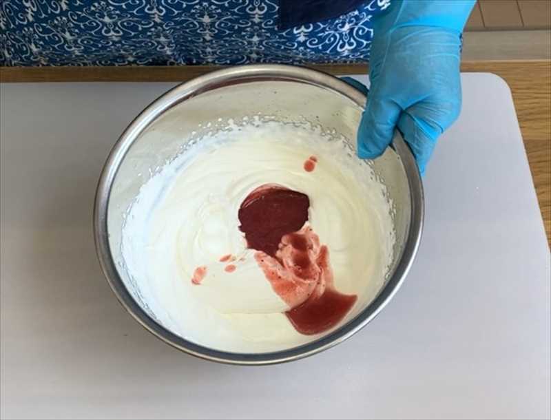 イチゴを加えたら泡立て器に持ち替えて混ぜていきます。