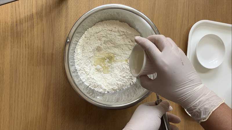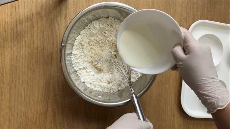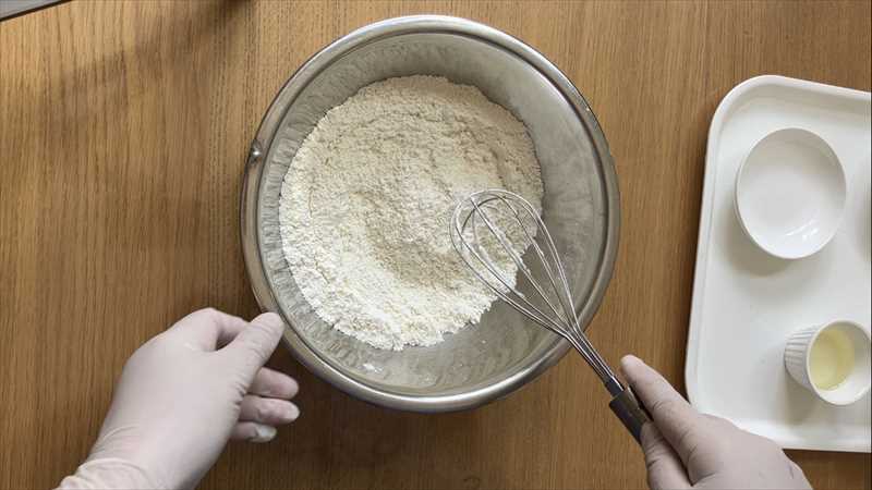 ボウルにお砂糖・薄力粉・ベーキングパウダーを入れて、泡立て器で混ぜ合わせる(粉振るいの代わり)