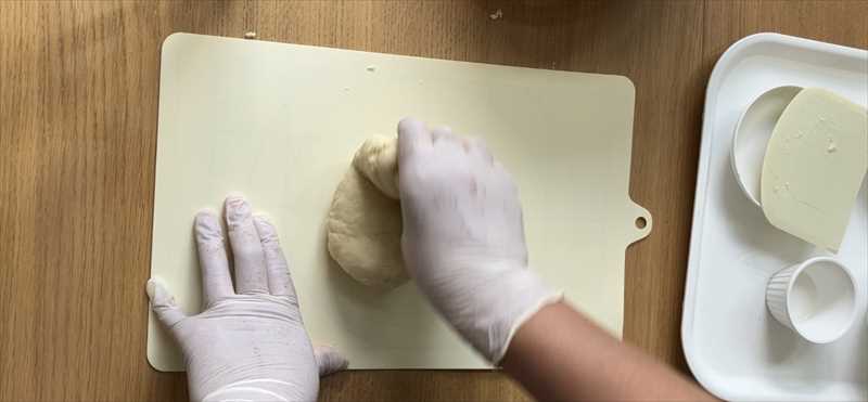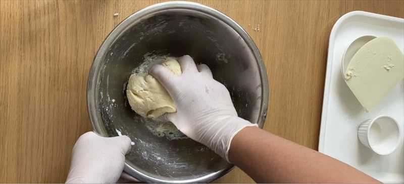 生地をボウルから出して、平らに伸ばし折りたたむようにまとめる