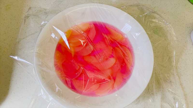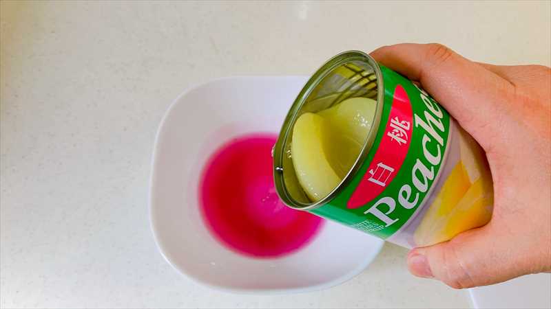 7スライスした桃に色シロップを流し入れ