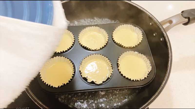 安全のため一旦火を止め、マフィン型を入れて、再度火をつけます(火傷に注意)