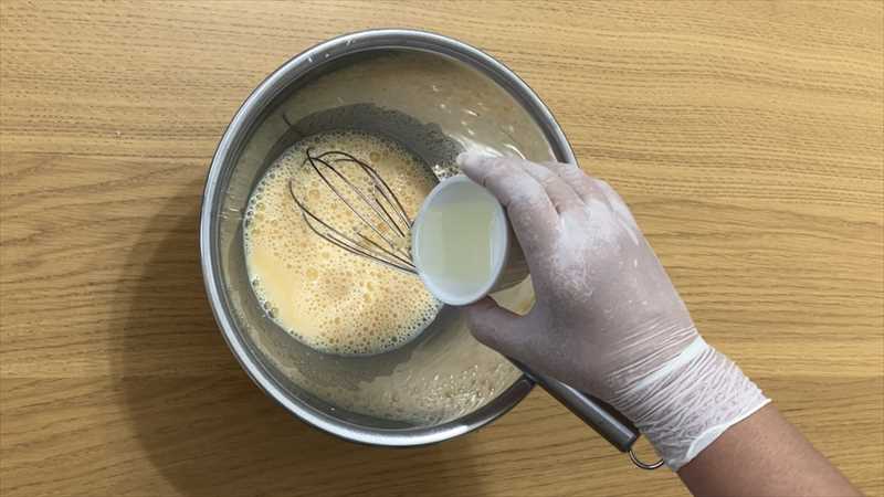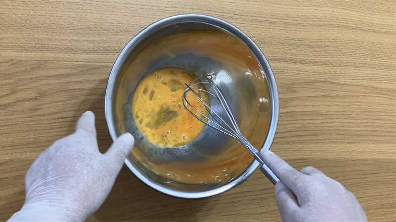 ボウルに卵を割り入れ、泡立て器で混ぜる