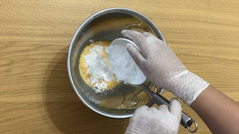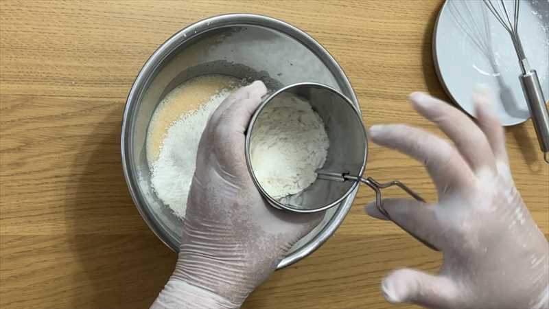 粉振るい器に薄力粉とベーキングパウダーを入れ、振るい入れる