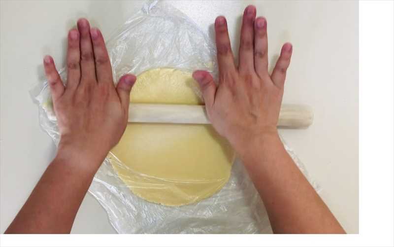 A: このタルト生地は伸びが良く扱いやすいため生地同士がくっつきやすく、簡単に修正できます。生地伸ばす時、型より一回り大きく伸ばします。型に移動することが少しテクニックが必要です。コツはビニール袋とめん棒をうまく使うことです。ビニール袋ごとめん棒で生地を持ち上げて移動すると失敗が少なくなります。型にぴったり合わせた後に、生地の端に切れ端や余分が出ることがあります。その切れ端や余った生地は、捨てずにタルトの側面の穴が開いた部分や薄い部分に指で押し当てて修正してください。